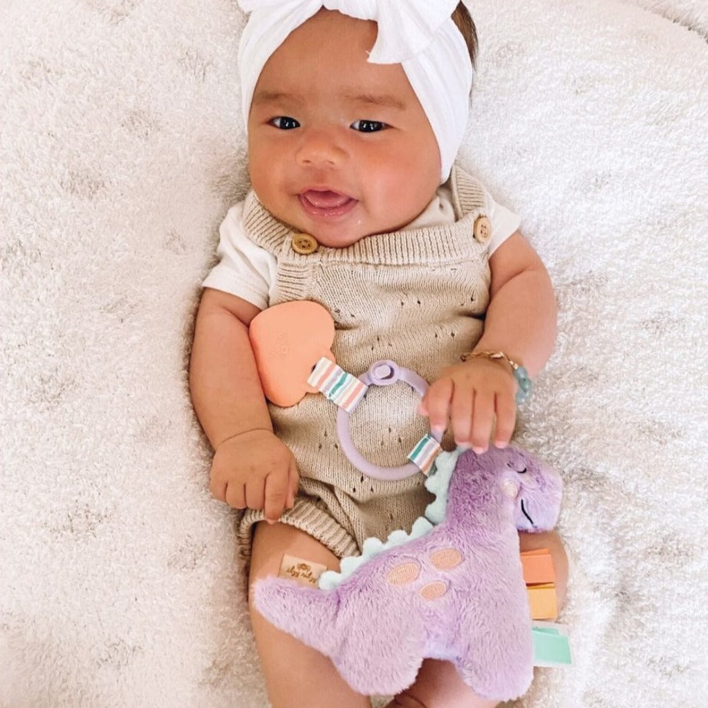 Connected to a handy dandy ring, baby can easily snuggle up to their plush lovey pal while soothing their gums on the attached teether. Plus, each character features entertaining crinkle sounds & textured ribbons for a playful pick-me-up!