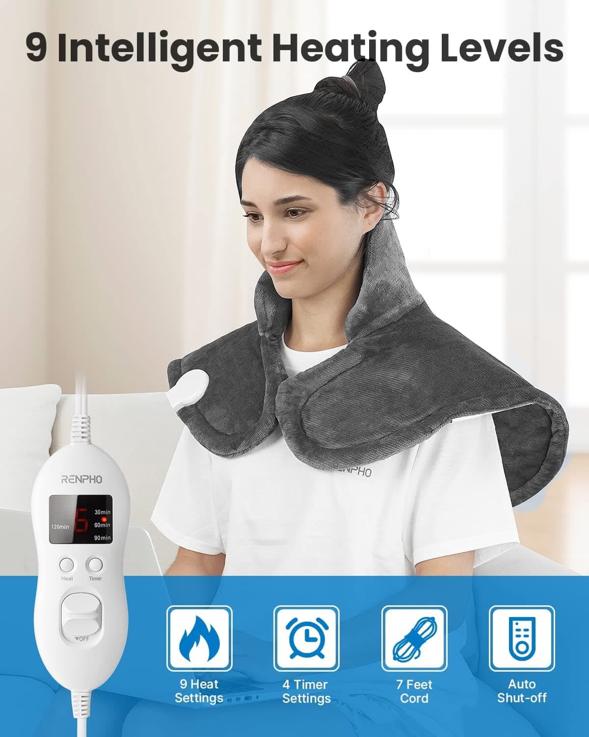 Designed to relieve aches and pains, this large, ultra-soft pad wraps around your neck and shoulders to soothe stiffness any time.