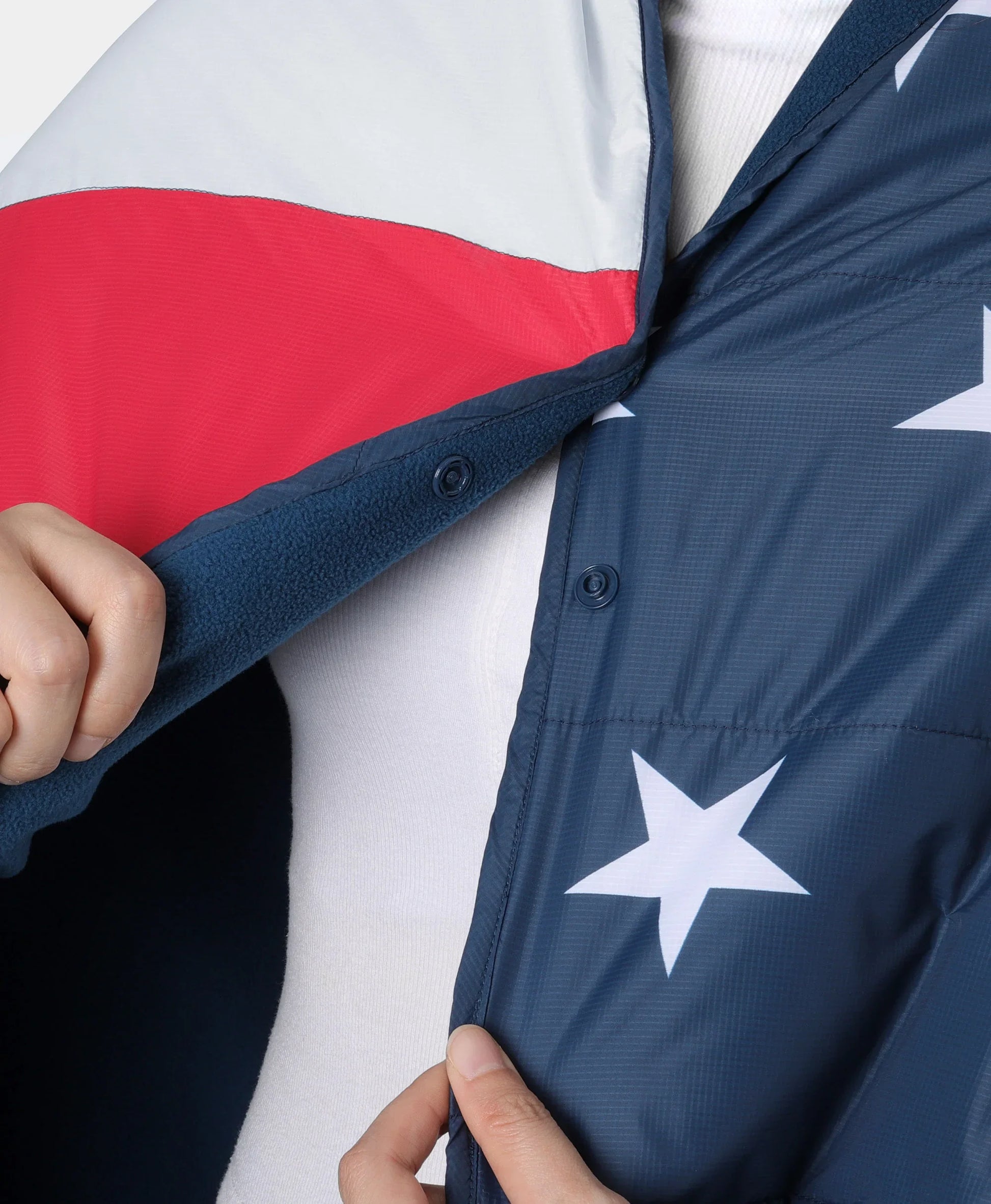 The Freedom Unisex 5-Zone Heated Blanket is built for comfort anywhere. From chilly stadium seats to campgrounds to cozy nights at home, this blanket has five evenly distributed heating zones and Fellex® 60g insulation delivering balanced, long-lasting warmth. A durable ripstop nylon shell protects it against outdoor conditions, while the ultra-soft fleece lining keeps the blanket comfortable against the skin. Designed for multifunctional use, it quickly transforms from a wearable shawl to ground mat or an indoor lap blanket using easy snaps. Featuring a USA-themed print and an interior battery pocket for streamlined portability, this blanket brings comfort, versatility, and American spirit to every adventure.